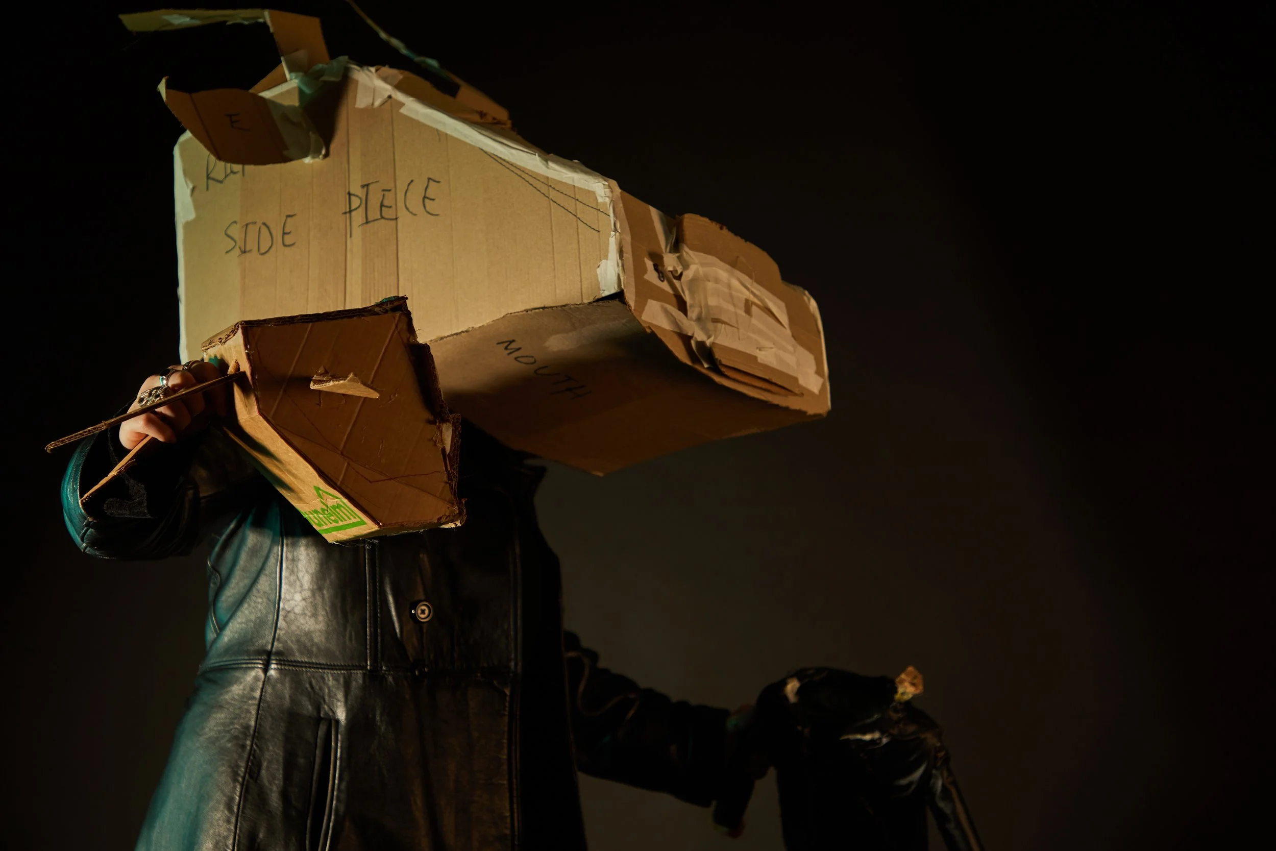 The cardboard cow head was frequently broken and fixed through its use in the photoshoots, acting as a vessel to show the passing of time. The ‘replica’ was made to mirror the character in the works in order to develop a sense of familiarity.